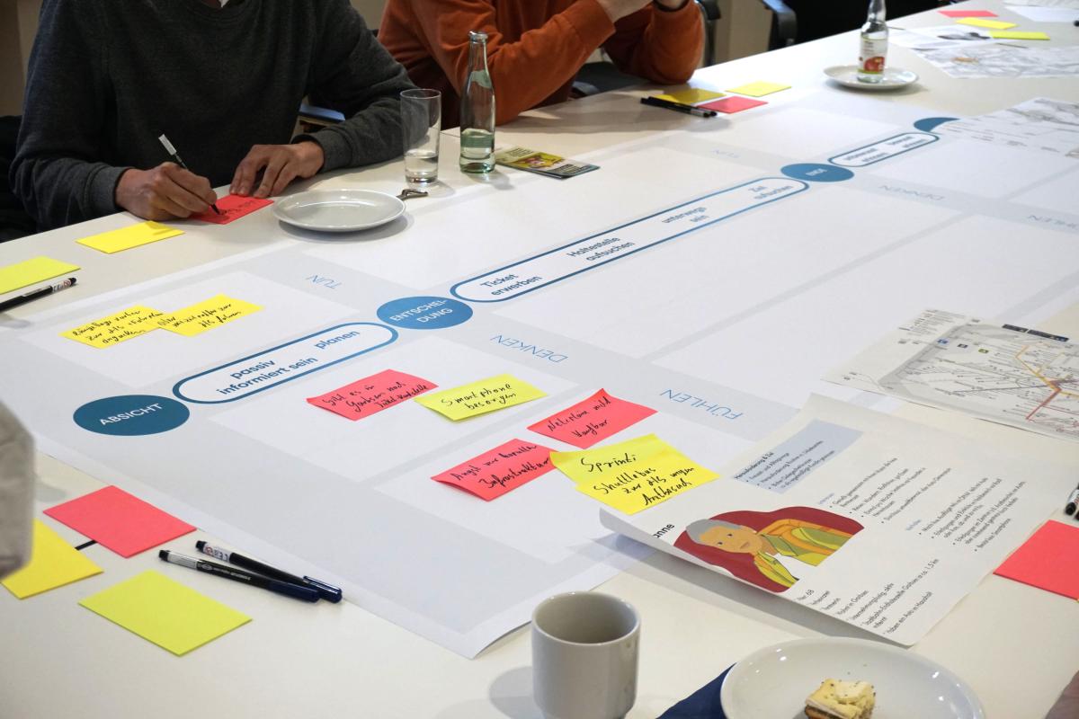 Mit einem nutzerorientierten Ansatz wurden in zwei öffentlichen Werkstätten Lösungen entwickelt, durch die die Stadtbahn Hannover noch attraktiver werden soll. Angelehnt an vorliegende Marktforschungs-Ergebnisse wurden fiktive Personae ausgearbeitet, anhand derer systematisch die Mover Journey durch das System Stadtbahn skizziert und Nutzungshürden aufgedeckt wurden. Die erarbeiteten Dokumente enthalten diverse Empfehlungen, Prüfaufträge und Maßnahmen, wobei das Themenfeld Orientierung in Haltestellen dabei eine prominente Rolle einnimmt.